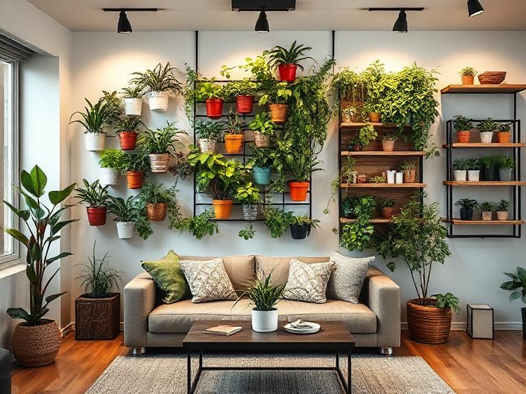 1. Jardines verticales en paredes pequeñas: Una excelente forma de aprovechar espacios limitados es instalar un jardín vertical. Puedes usar estructuras de madera reciclada, bolsillos de tela o marcos metálicos. Esta opción funciona perfecto para quienes buscan ideas para decorar una sala pequeña con poco dinero.