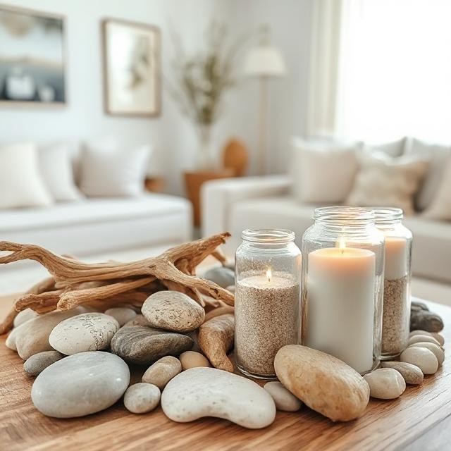 1. Centros de mesa: Crea composiciones con piedras blancas, arena y velas en frascos de vidrio reciclado. Ideal para un estilo boho o minimalista.